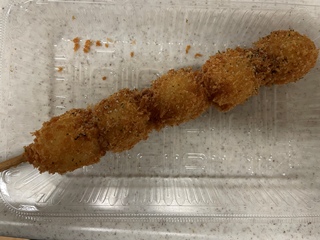 レバーカツ、広島県江田島産大粒牡蠣フライ、チーズとろけるさつまいもと紫いもの包み揚げを購入。