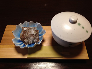 | ▲ 鰻 里芋 胡麻クリーム焼き 菊花ゼリー寄せ ソルトリーフ湯葉和え |